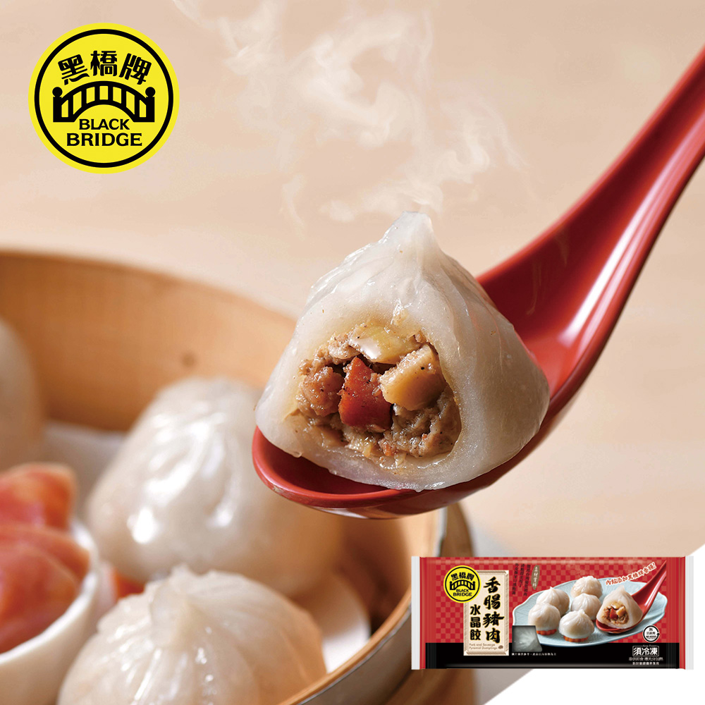 1.香腸豬肉水晶餃-水、筍角、黑橋牌蒜味香腸(豬肉(台灣)、豬背脂、糖、豬腸衣(法國)、調味劑(L-麩酸鈉)、甜味劑(D-山梨醇液70%)、蒜粉(麥芽糊精、蒜頭抽出物、二氧化矽)、食鹽、調味劑(乳酸鈉液)、複方保色劑[食鹽、保色劑(亞硝酸鈉、硝酸鉀)、麥芽糊精]、甘草水(水、甘草)、蒜抽出物(大豆油、蒜頭抽出物)、結著劑(焦磷酸鈉、多磷酸鈉)、複方品質改良劑[調味劑(胺基乙酸)、醋酸鈉(無水)、酵素製劑(溶菌酶)]、抗氧化劑(L-抗壞血酸鈉)、甜味劑(甘草素、甘草萃)、調味劑(dl-胺基丙酸))、樹薯澱粉、豬絞油(台灣)、豬肉(台灣)、在萊米粉(在萊米粉、玉米澱粉、小麥澱粉、馬鈴薯澱粉、碗豆澱粉)、粘稠劑(醋酸澱粉)、糖、麻油、醬油、蒜頭、鹽、辣豆瓣醬[黃豆(非基因改造)、辣椒、水、鹽、砂糖]、調味劑(L-麩酸鈉)、黑胡椒粉、黑芝麻粉、花生粉、五香粉(肉桂、丁香、山奈、小茴香、甘草、大茴香)、肉桂粉(肉桂、香料)、百草粉(丁香、川芎、肉桂、大茴香、小茴香、荳蔻、甘草)、花椒、大茴香。 (過敏原-本產品含麩質穀物、大豆、芝麻及花生其製品,對此過敏者請避免食用。)