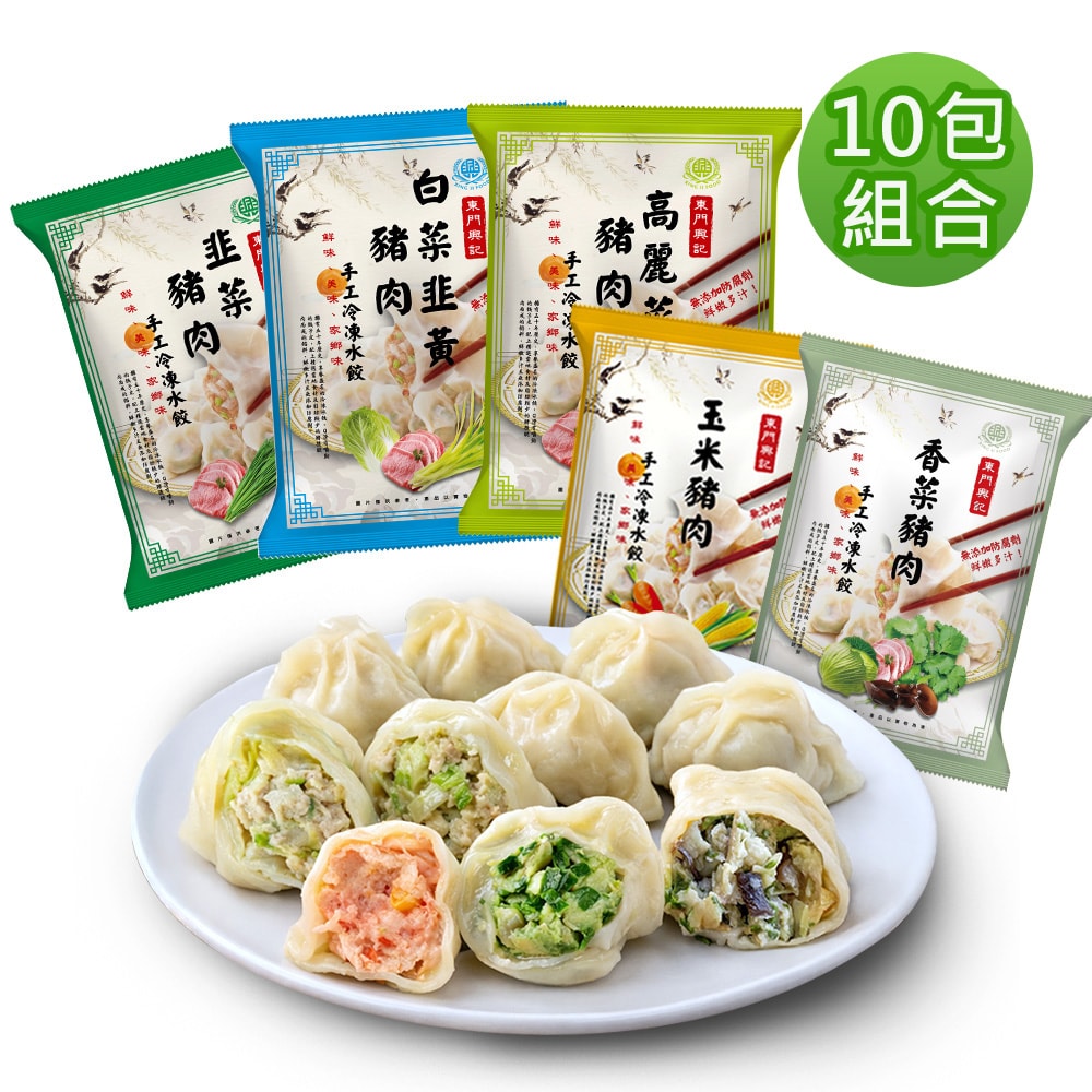 商品名稱:【東門興記】(免運)手工豬肉水餃10包組(高麗菜/韭菜/白菜韭黃/玉米/香菜)