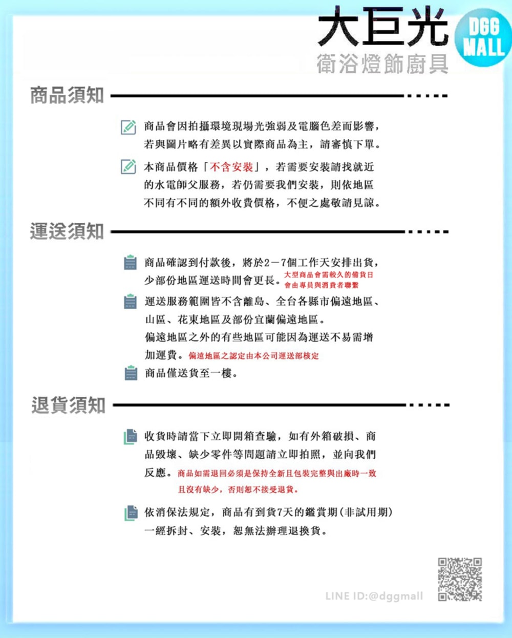 ※燈具不含燈泡、燈管、釘牆螺絲包、說明書,但詳細說明內的規格若有註明含燈泡燈管,則有附加。