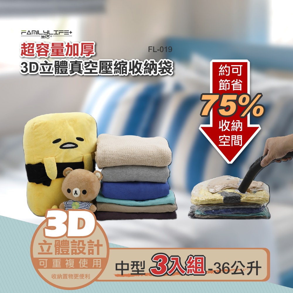 ●超容量加厚3D立體真空壓縮收納袋系列計有3種尺寸: