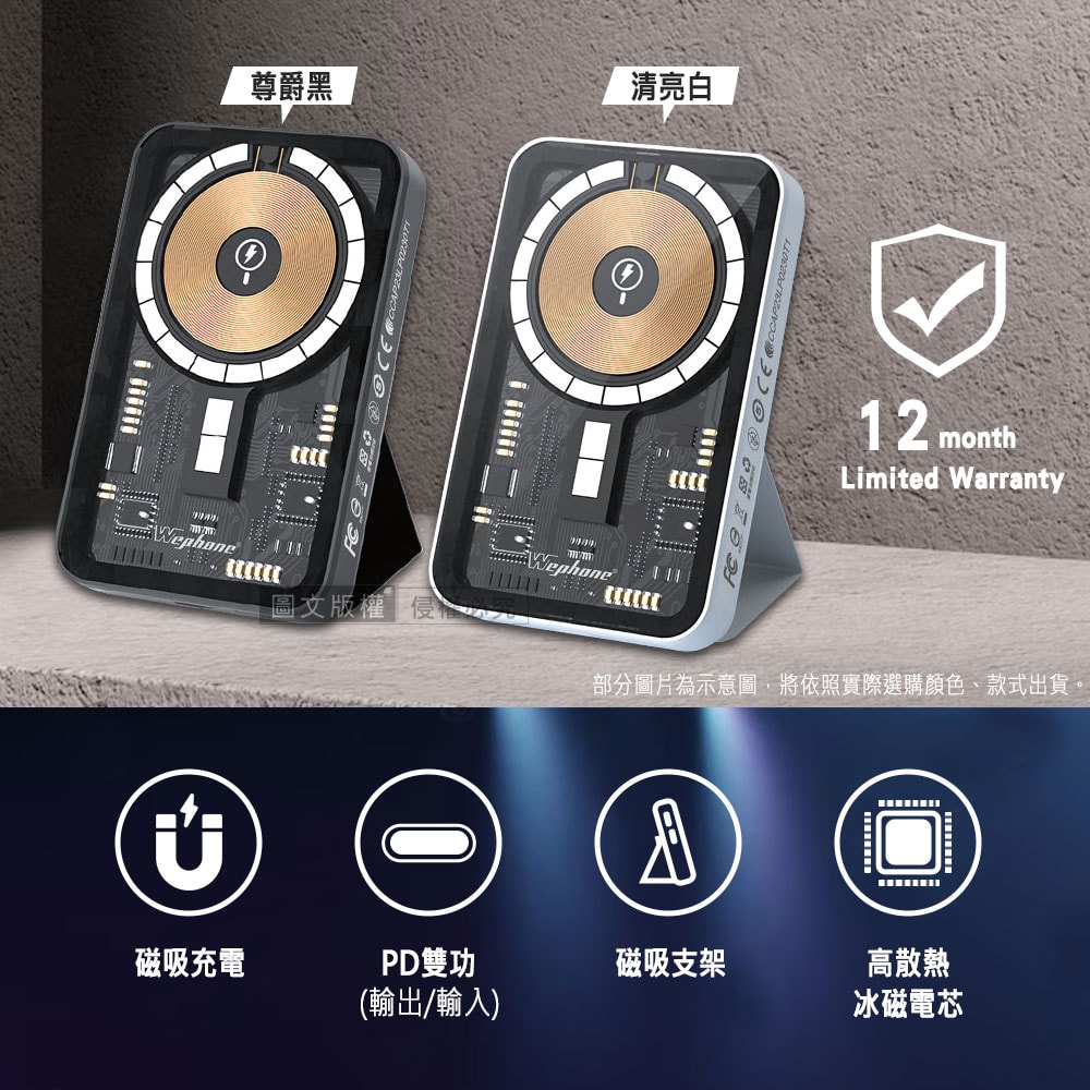 Wephone 5000mAh PD快充 MagSafe工業風透明磁吸支架行動電源 可上飛機