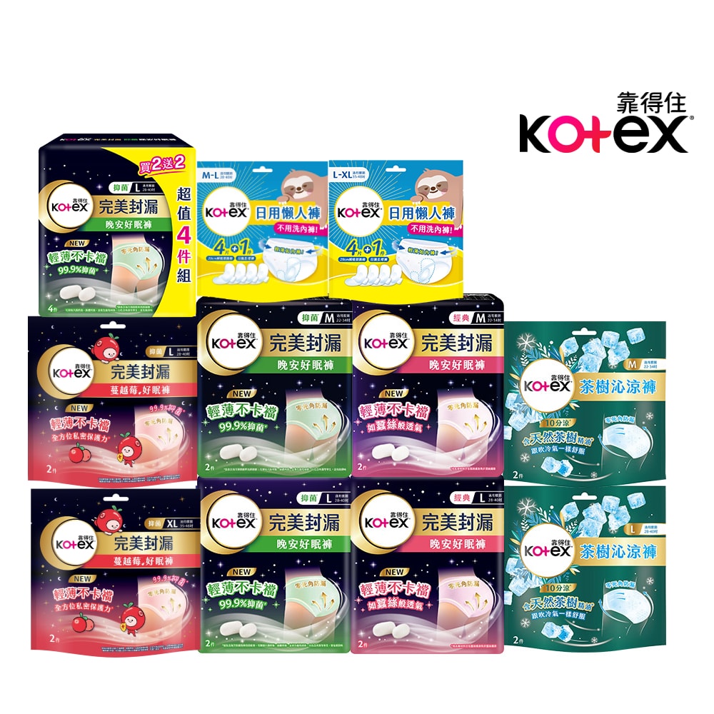 【Kotex 靠得住】 晚安好眠褲-經典/抑菌/茶樹沁涼/蔓越莓抑菌 日用懶人褲 (褲型衛生棉) 箱購