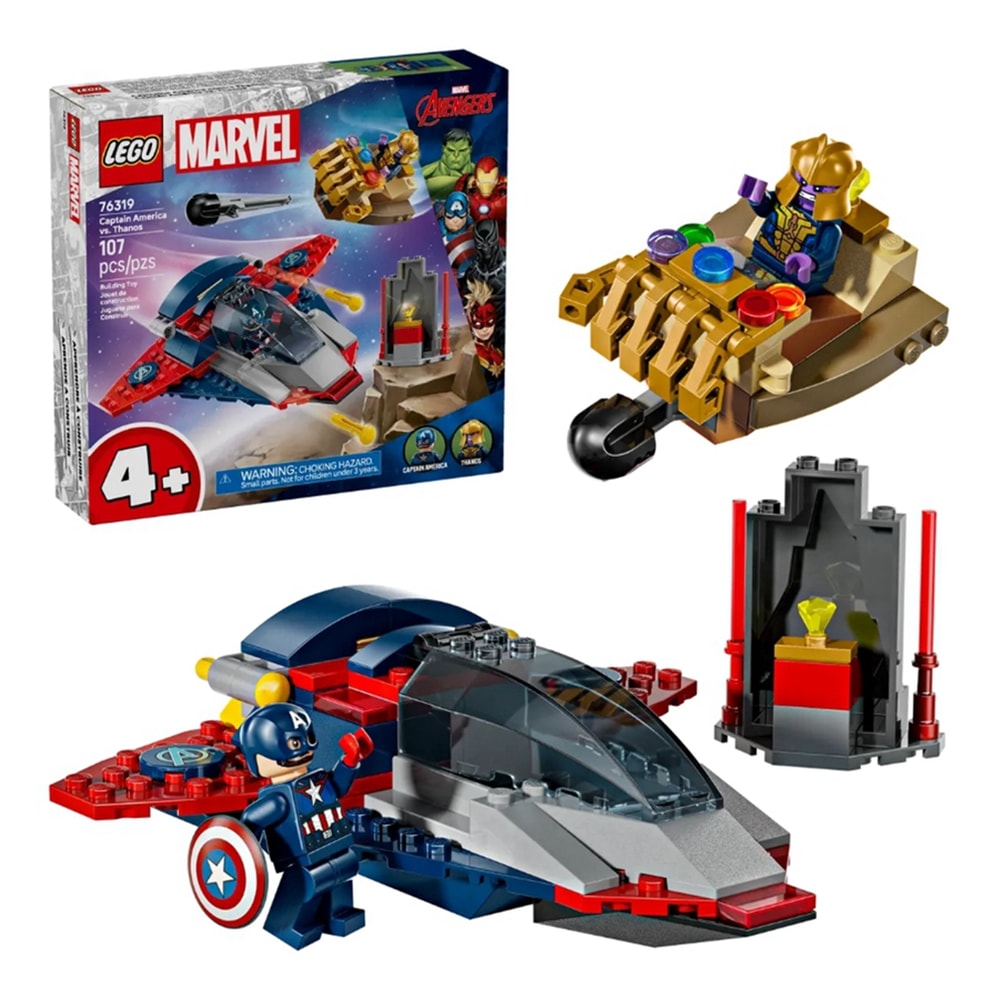 這款可拼砌和遊玩的玩具包含 2 隻人偶:薩諾斯與美國隊長。薩諾斯開著太空船,其設計看起來就像他的無限手套,有可動「手指」和飛彈發射器;美國隊長駕駛超時尚的昆式戰機,機身搭載 2 支射擊器、可打開的駕駛艙,以及放盾牌的暗格。美國隊長嘗試阻止薩諾斯偷走珍貴的寶石時,包含宇宙寶石的獨立模型可激發想像遊戲。盒裡每個袋子均含積木與大型入門款積木,可快速拼砌成模型和角色,讓遊戲能迅速開始。直觀的拼砌說明以色彩繽紛的手冊提供。內含 107 個零件。