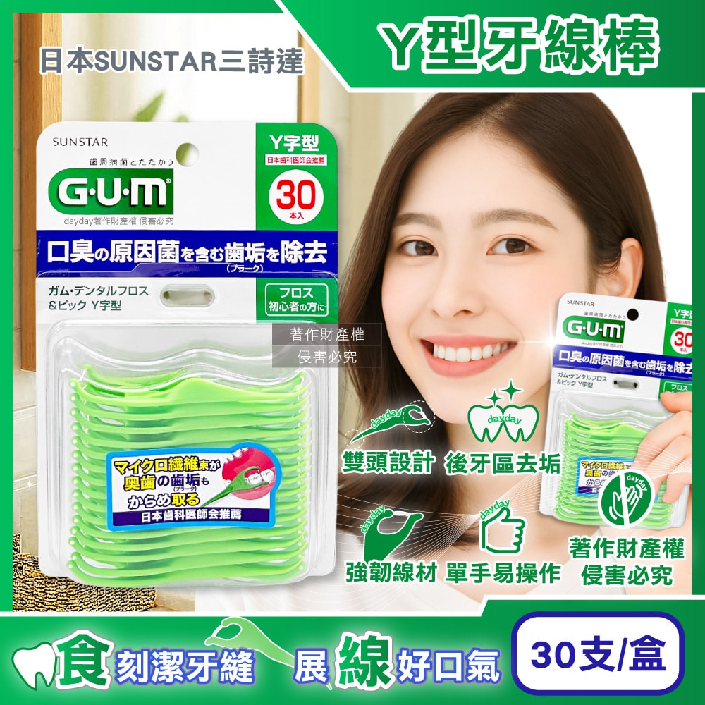 【Sunstar 三詩達】 GUM後牙區齒縫去垢牙周護理Y型牙線棒30支/盒(後排臼齒除殘渣潔牙線,牙籤雙功能清潔棒組合包,飯後口腔保健剔牙工具)