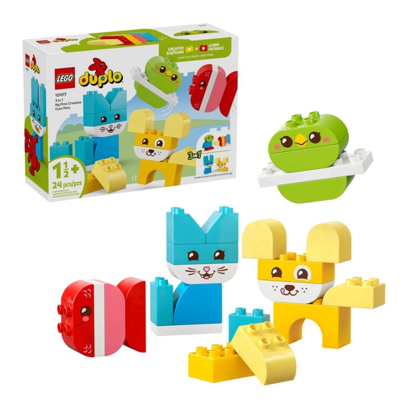 小小拼砌者可使用 24 個專為最年幼的孩子設計、容易操作的積木,選擇製作狗狗、貓咪、小鳥、兔子、老鼠和魚的拼砌式玩偶。其中有些動物幼兒玩具採用單色樂高得寶系列積木。小小拼砌者可學習依顏色分類來製作自己的寵物,然後為動物加上友善的臉孔,完成玩偶。